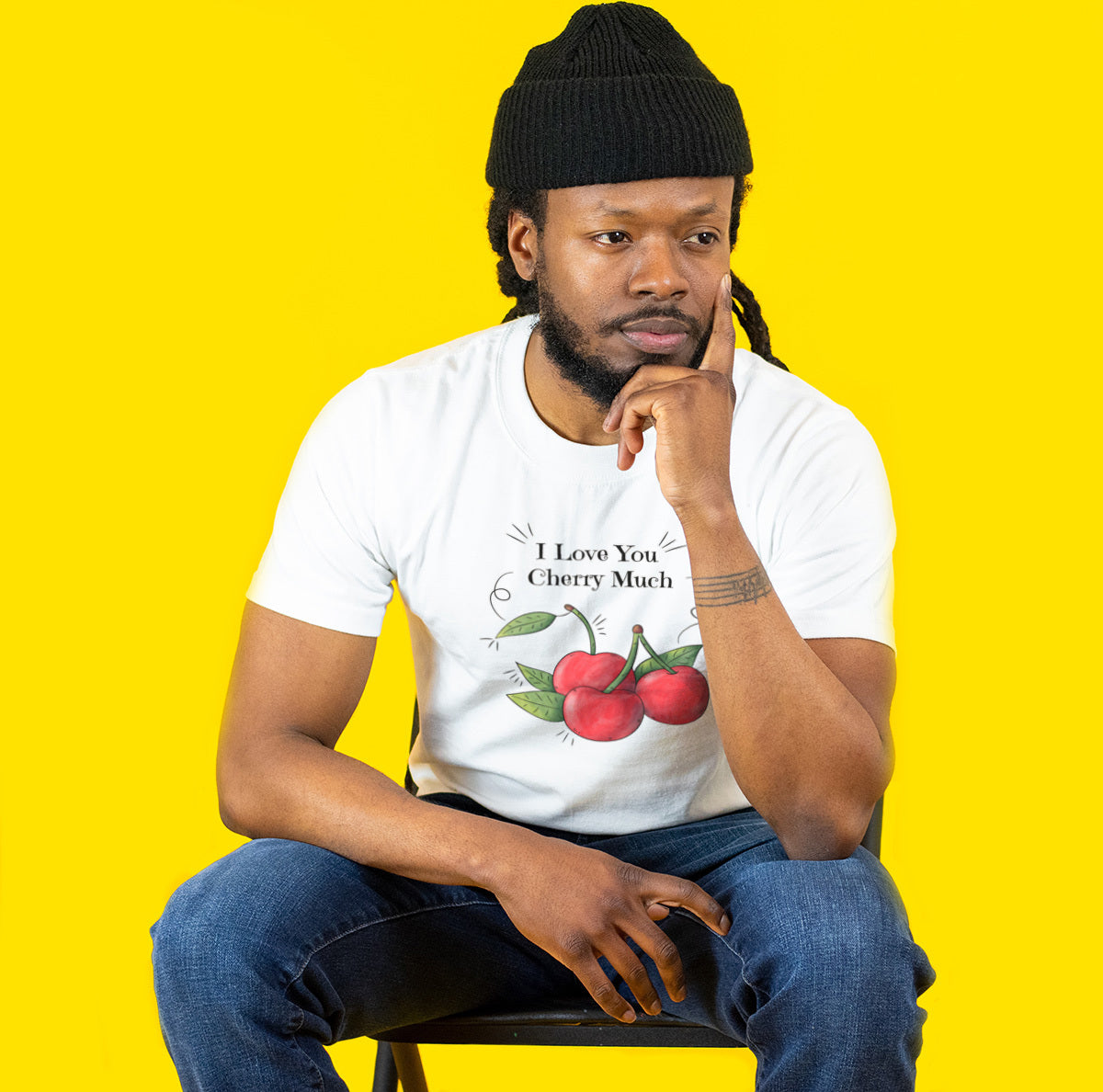 This adorable tee blends fruity charm with punny romance! Featuring three watercolour-style cherries with bright leaves and a cheeky declaration of love, it’s perfect for spreading smiles, sweetness, and those flirty vibes.