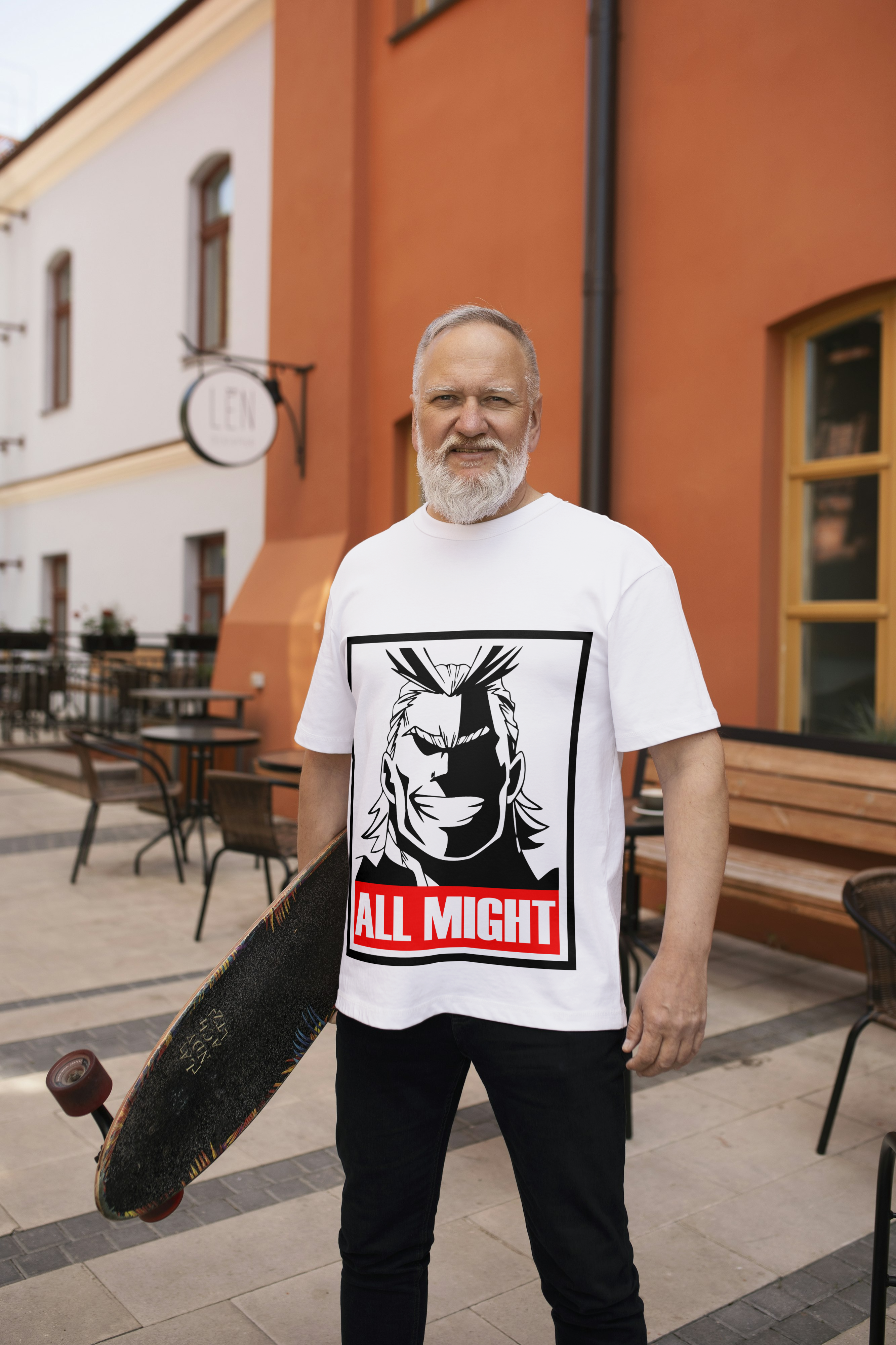 Go beyond with this bold tee: All Might’s powerful grin and iconic silhouette command the front in a striking black-and-white motif. For fans who stand tall and inspire hope—wear your hero’s legacy and let your spirit say, “I am here!”